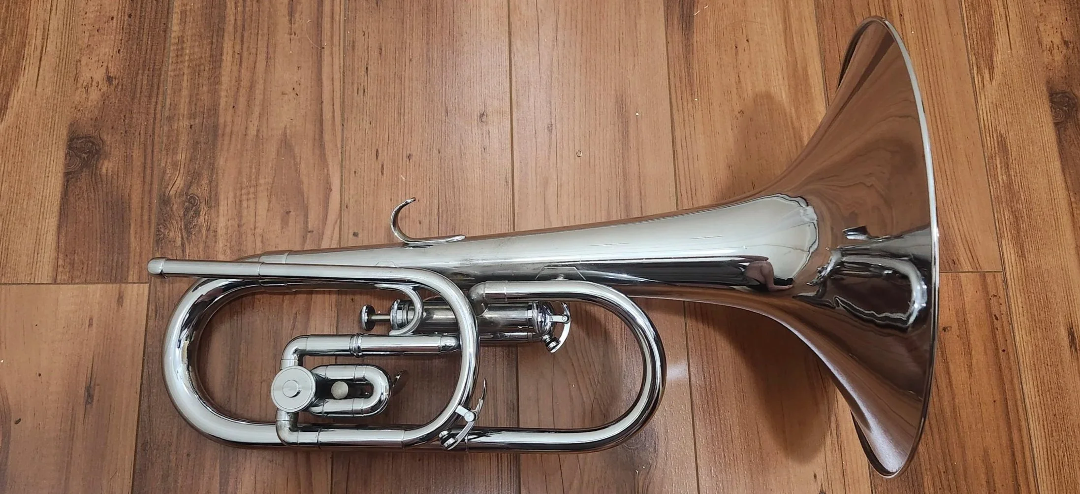Elkhart alto flugelhorn - This alto flugelhorn is in F, with Eb slide. It is stamped Elkhart, but was made by Couesnon. It was a perfect match to my Couesnon flugelhorn in both sound and feel, and was one of the easier-to-play weird alto brass instruments I’ve owned. But it still had its quirks, and I later acquired a Kanstul KMA-275 marching alto in F that, while technically not an alto flugelhorn, did the alto flugelhorn thing even better than this actual alto flugelhorn. So, I sold it off.