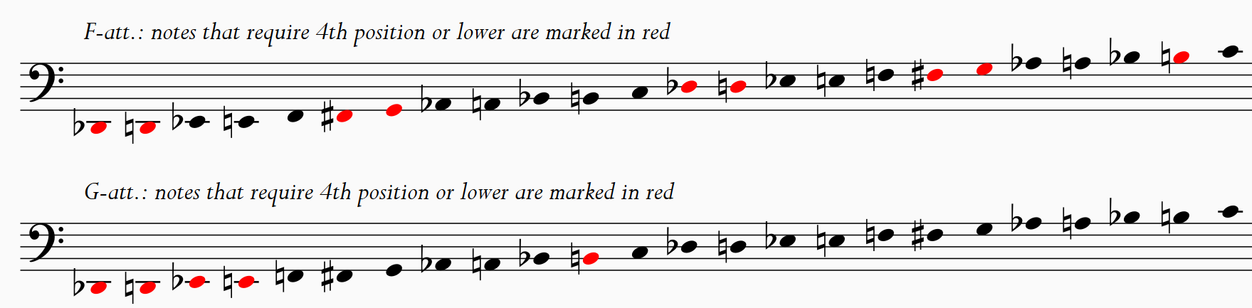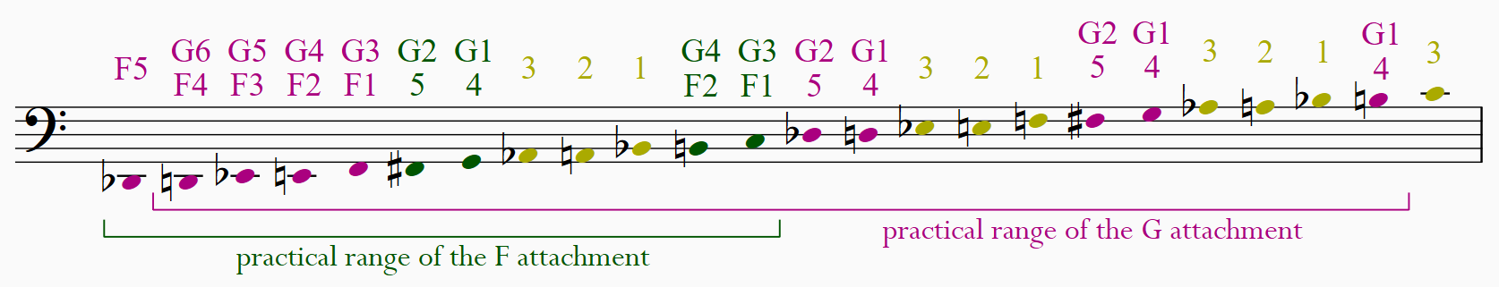 Shown above are the practical positions for the F and G attachments. This is obviously not every possible note the valves can play, but instead the notes that are either not possible without the valve, or they replace the only or most common open slide position. This is an important distinction because, for example, you can play A3 (top of the bass clef staff) in T1 with an F valve, but doing that is the equivalent of playing it in 6th position on the open horn, which is something that is rarely needed when you have a much better option in open 2nd. Contrast that with the B at the top of the staff you have access to in T1 with the G valve. Playing this note in T1 is functionally identical to playing it in 4th position without the valve, which is the standard position for that note. Yes, you can also play it in 7th (which is what playing it in T2 with an F valve is equivalent to), but you would never do that except for specific circumstances like glissandi because 4th is much more secure.
